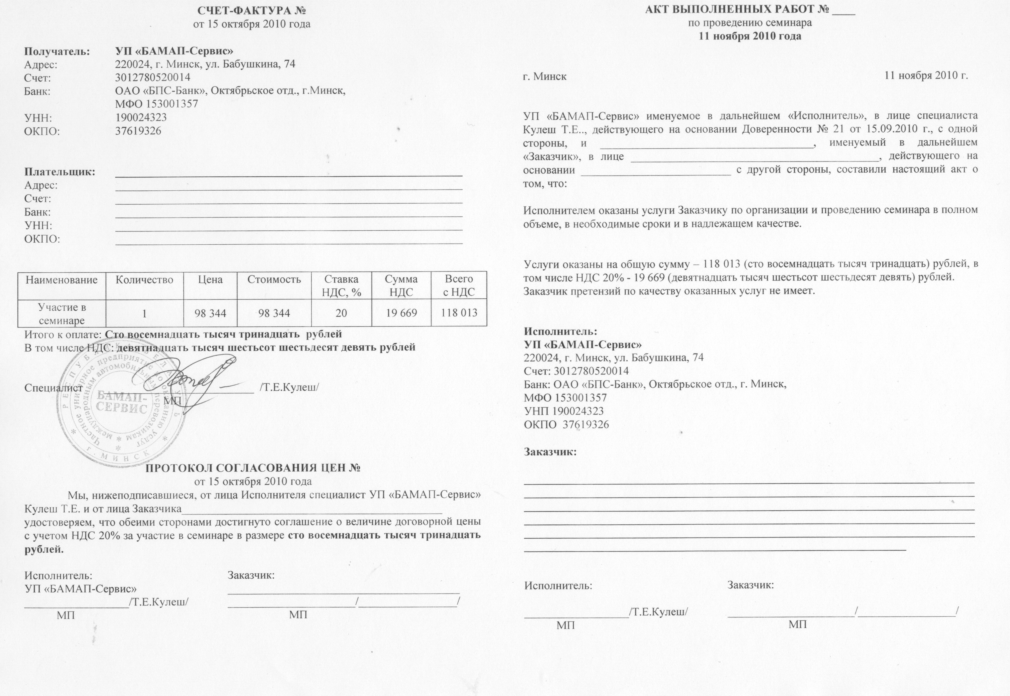 Оригинал счета-фактуры и акта выполненных работ будут выданы на семинаре.
