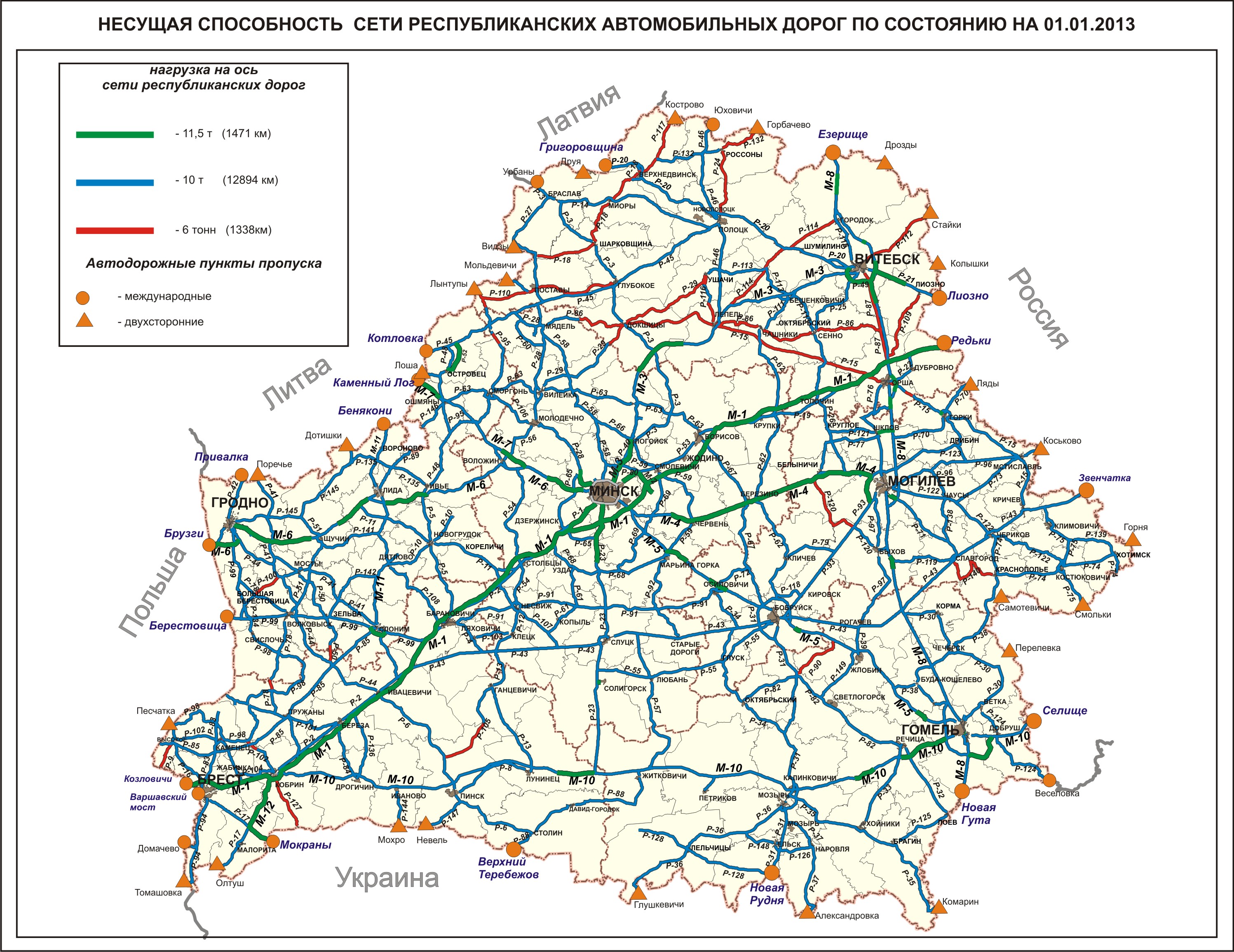 Сводный перечень республиканских автомобильных дорог с несущей способностью дорожных одежд 6 тонн, 10 тонн и 11,5 тонны на ось подготовлен во исполнение п.6 Указа Президента Республики Беларусь № 613 от 26.11.2010 года «О проезде тяжеловесных и (или) крупногабаритных транспортных средств по автомобильным дорогам общего пользования» на основании диагностики автомобильных дорог и с учетом предложений республиканских унитарных предприятий автомобильных дорог. Данный перечень предназначен для обеспечения весогабаритного контроля на автомобильных дорогах и выдачи специальных разрешений на проезд ТКТС по автомобильным дорогам. Несущая способность дорожных одежд 6 тонн, 10 тонн и 11,5 тонны на ось республиканских автомобильных дорог по состоянию на 01.01.2013 года распределяется следующим образом: