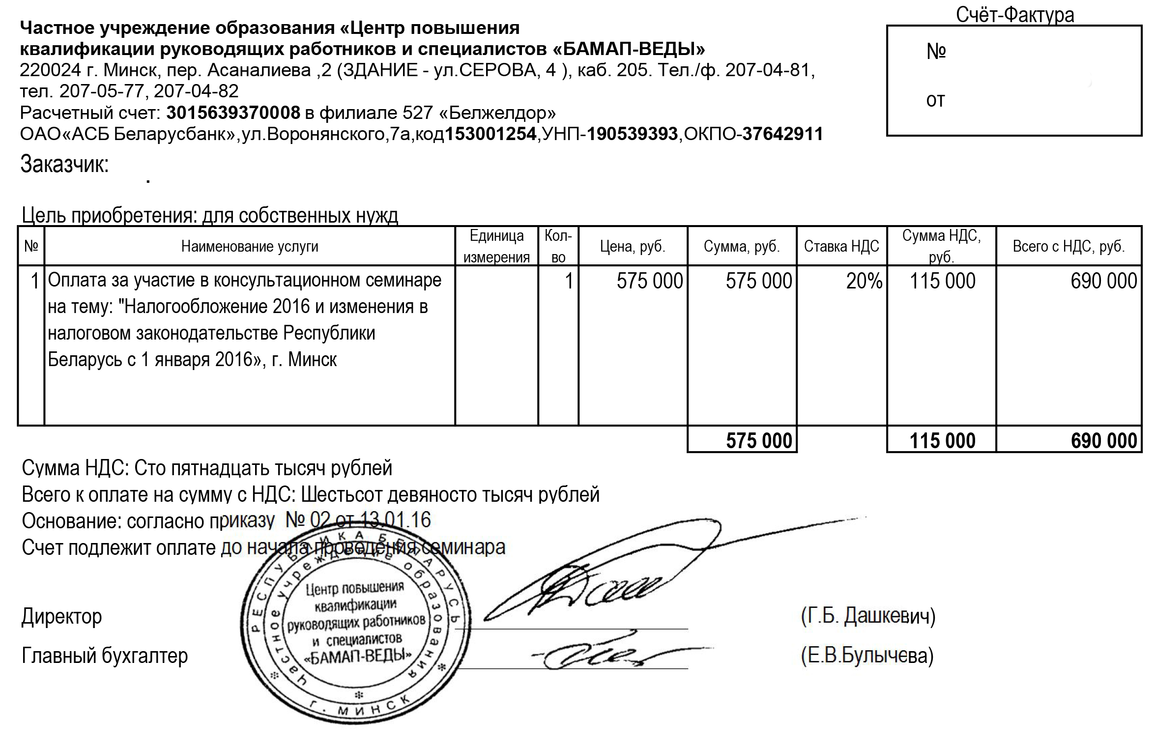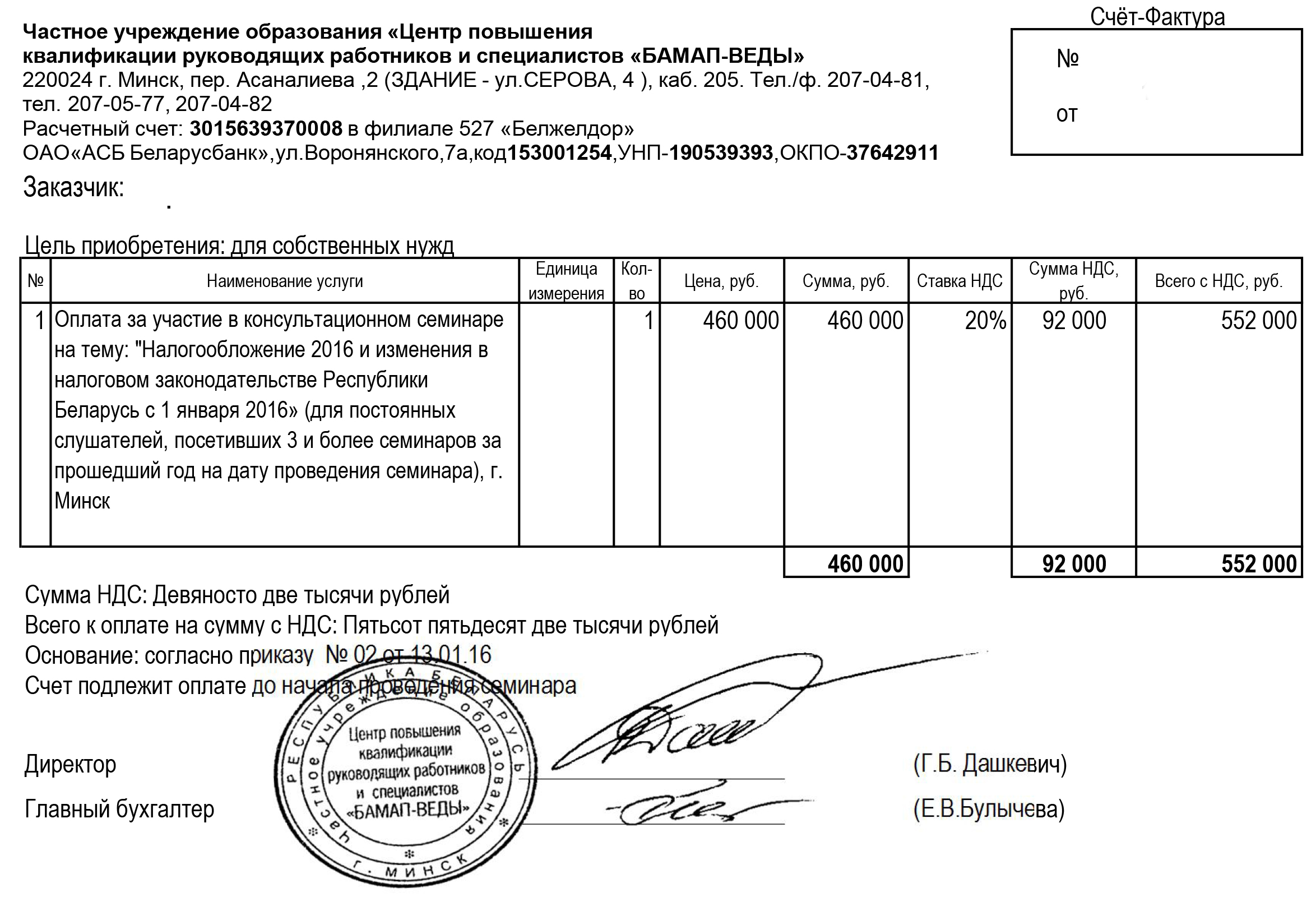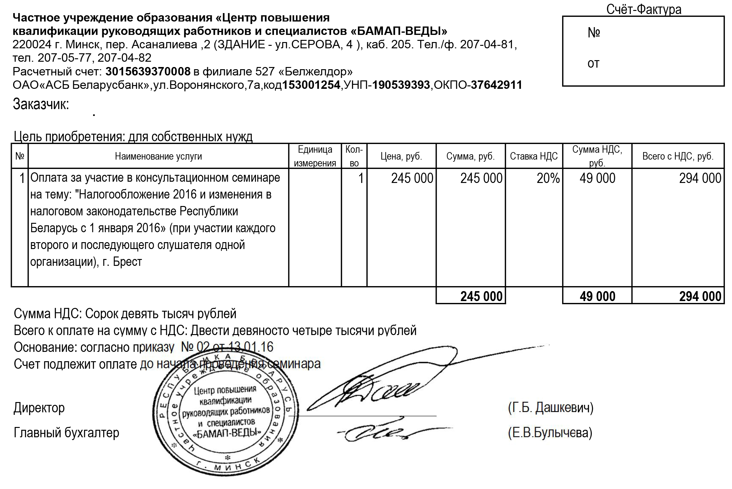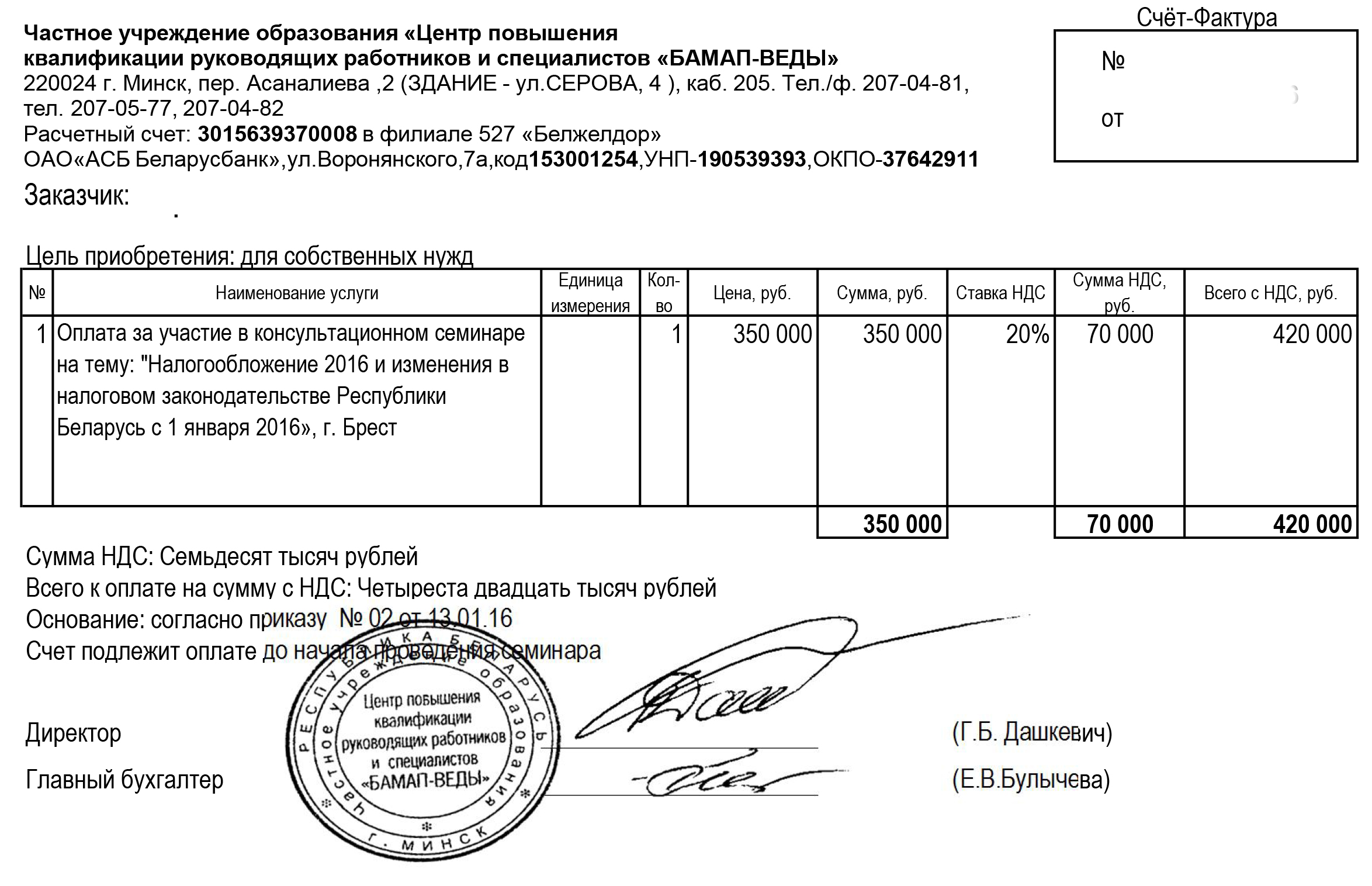 Приглашаем бухгалтеров принять участие в консультативном семинаре на тему: «Налогообложение 2016 и изменения в налоговом законодательстве Республики Беларусь с 1 января 2016». Дата проведения: 1 февраля 2016 года Начало регистрации: 09.00 Время проведения: 09.30-12.30 Место проведения: Ассоциация международных автомобильных перевозчиков «БАМАП», г. Минск, Бетонный проезд 23, к.501 Стоимость для слушателей в г. Минске: 690 000 бел. рублей Прямая видеотрансляция: представительство Ассоциации «БАМАП» в г. Бресте, ул. Дзержинского, 50 Стоимость для слушателей в г. Бресте: 420 000 бел. рублей Внимание! АКЦИЯ!: - для каждого второго и последующего слушателя одной организации предоставляется скидка в размере 30% - для постоянных слушателей, посетивших 3 и более семинаров за год (на дату проведения семинара) предоставляется скидка в размере 20%. В семинаре примет участие лектор: Сузанский В.Е., директор ООО «Грант Торнтон Консалт», аудитор, ведущий консультант по бухучету и налогообложению, член редколлегии журнала «Главный бухгалтер», Справки по вопросам проведения по тел.: +375 (17) 398-44-85, +375 (44) 752-98-06 e-mail для заявок: office@bamap-vedy.by факс для заявок: +375 (17) 207-04-81 Договор на участие в семинаре г. Минск Счет за участие в семинаре г. Минск