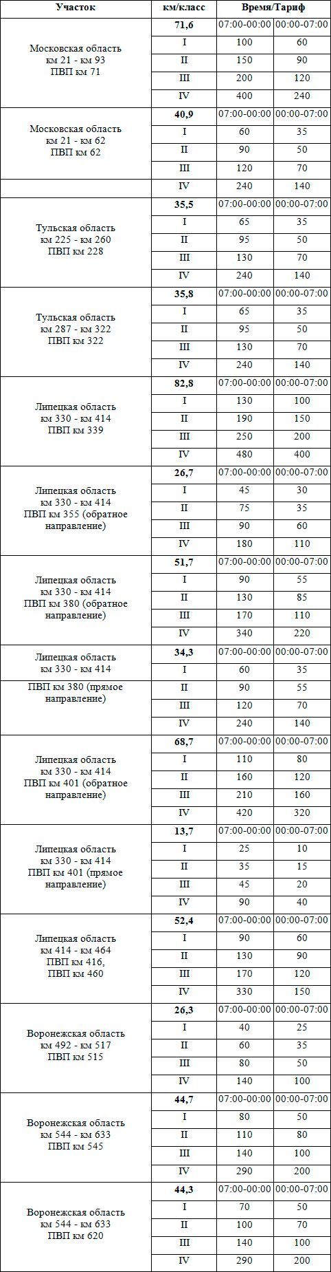 При этом на участках М-4 «Дон» с км 93 по км 211 (расположен в Московской и Тульской областях) и с км 517 по км 544 в обход села Новая Усмань (в Воронежской области), платность на которых была введена в 2016 г., стоимость проезда не изменится.